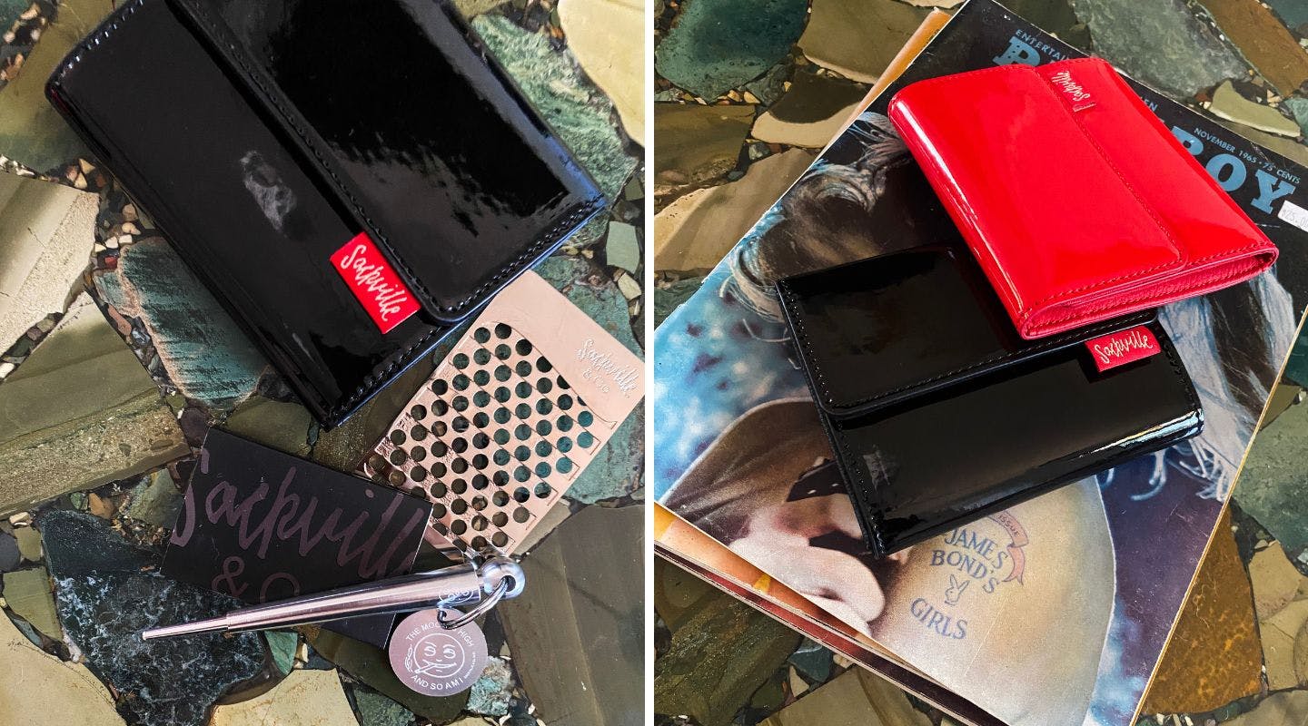 This sleek stash wallet features a glossy black finish and essential silver tools, perfect for those late-night study sessions or literary meet-ups.